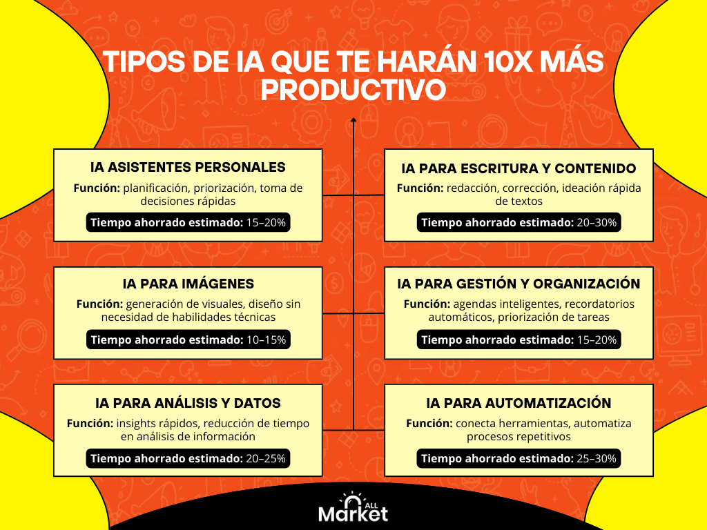 La clave para multiplicar tu productividad no es usar una sola herramienta, sino combinar distintos tipos de IA según la tarea. Cada categoría ataca un cuello de botella específico del tiempo y la energía mental.