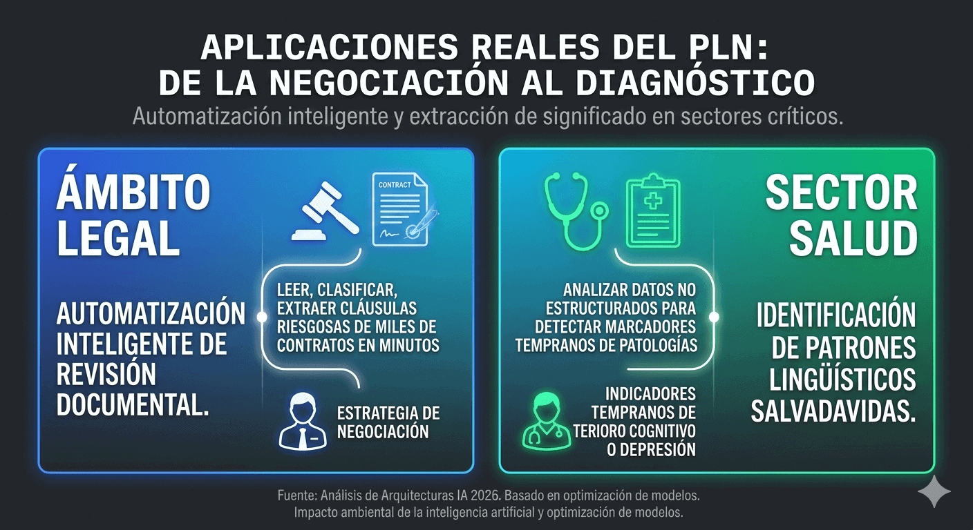En el sector salud, el impacto es igualmente profundo y potencialmente salvavidas. Mediante el análisis de datos no estructurados en historias clínicas, el PLN permite identificar patrones lingüísticos que actúan como indicadores tempranos de patologías.