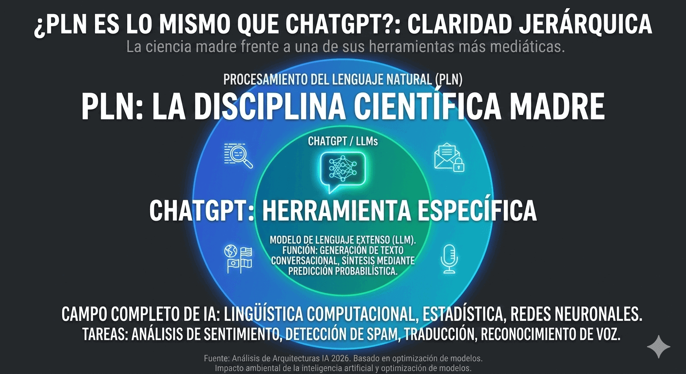 Existe una confusión común en el ecosistema digital actual: equiparar la disciplina científica con una de sus herramientas más mediáticas. Es fundamental aclarar que el procesamiento del lenguaje natural representa el campo de estudio completo dentro de la inteligencia artificial, mientras que productos como ChatGPT son implementaciones específicas y comerciales de esta tecnología.