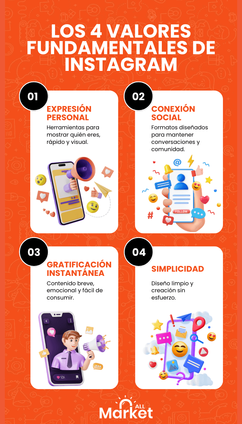 Instagram ofrece una propuesta de valor única basada en un principio psicológico muy simple: las personas comparten aquello que impulsa su identidad, despierta emociones intensas y es fácil de consumir. Desde 2010, la plataforma entendió —antes que cualquiera— que el contenido visual tiene un poder cognitivo y emocional incomparable. Por eso su núcleo siempre fue la simplicidad extrema, algo que sigue siendo la base de su éxito actual.