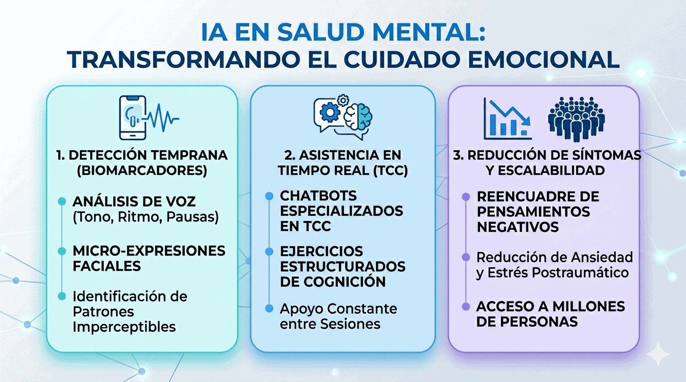 En interfaces visuales, la IA analiza micro-expresiones faciales casi imperceptibles, permitiendo un nivel de monitoreo constante que ayuda a prevenir crisis antes de que estas se manifiesten plenamente. Esta capacidad de observación técnica transforma el dispositivo móvil en un sensor centinela que alerta sobre cambios sutiles en la salud emocional del paciente.