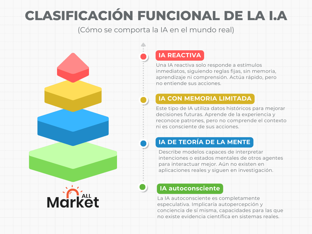 Analizar los tipos de IA desde una perspectiva funcional implica observar cómo operan frente a tareas concretas, más allá de su arquitectura técnica. Esta clasificación se centra en las capacidades prácticas de los sistemas y permite entender qué nivel de adaptación, aprendizaje o interpretación del entorno pueden alcanzar. Hablar de tipos funcionales de IA ayuda a distinguir entre tecnologías que simplemente reaccionan a estímulos y aquellas que, al menos en teoría, podrían desarrollar comportamientos más complejos.